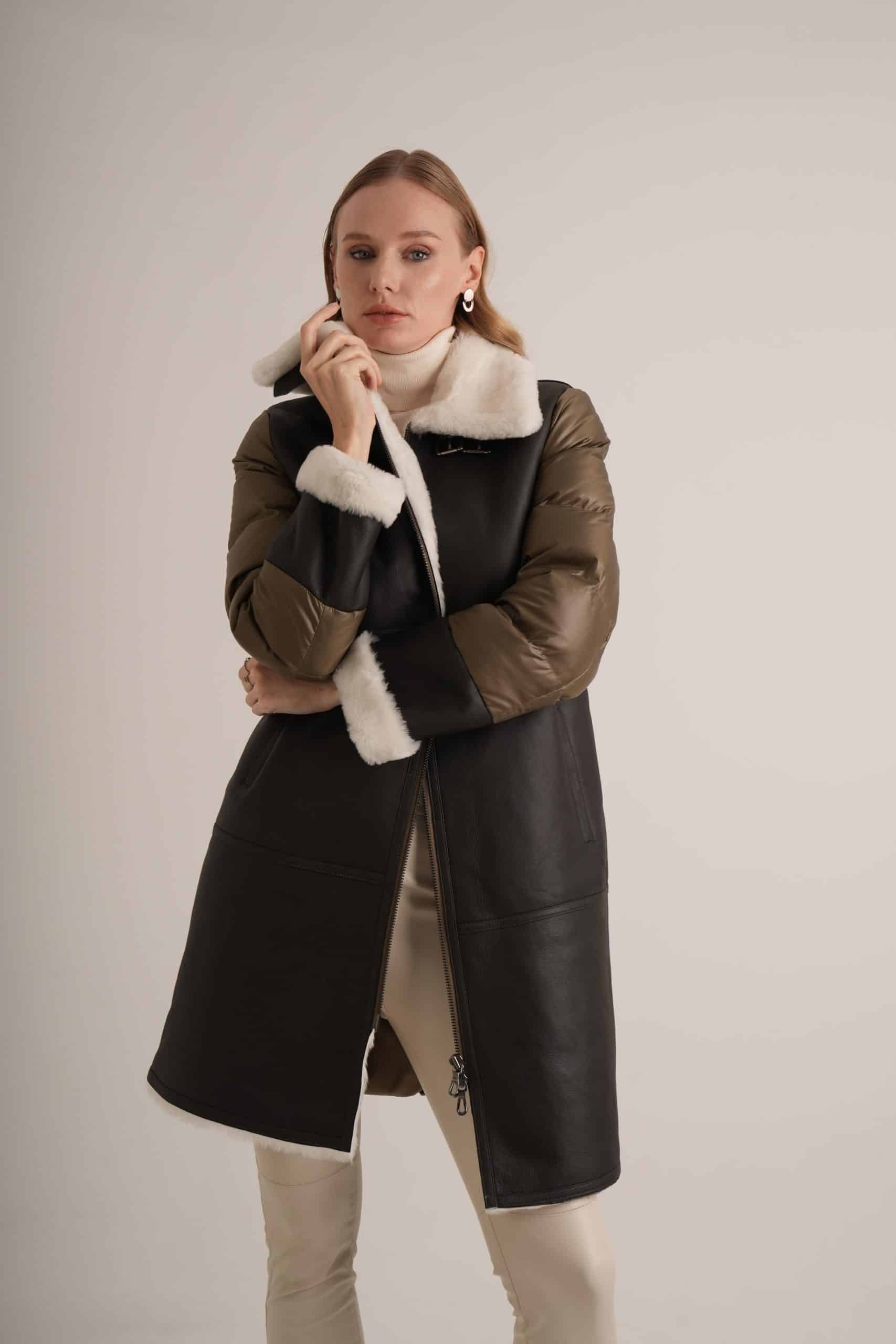 Yüksek kaliteli kuzu derisi ve yağmurluk kumaşından yapılmış kombine bayan kabanı. dolgu – doğal kuş tüyü. Kollar ve sırt dikişlidir. Dikiş sayesinde dolgu deforme olmaz ve ürün şeklini korur. su geçermez ve rüzgara dayanıklı kumaş .Ürün uzunluğu 95 sm. Arkadan ve kollardan astar – 100% polyester. İç kısımdaki ön kısım hakiki kuzu yününden yapılmıştır. Yakada iki adet deri kayış bulunmaktadır . Soğuk ve rüzgarlı havalarda, sadece askıları bağlayin ve sıcak rahat olacaksınız. Kabanın iki yönlü fermuarı var. 2 yönlü fermuar pratiklik katar. ürün -35 dereceye kadar giyilebilir. Kaban üç renkte dikilir: olive, lacivert, siyah. Türkiye’de yapıldı.